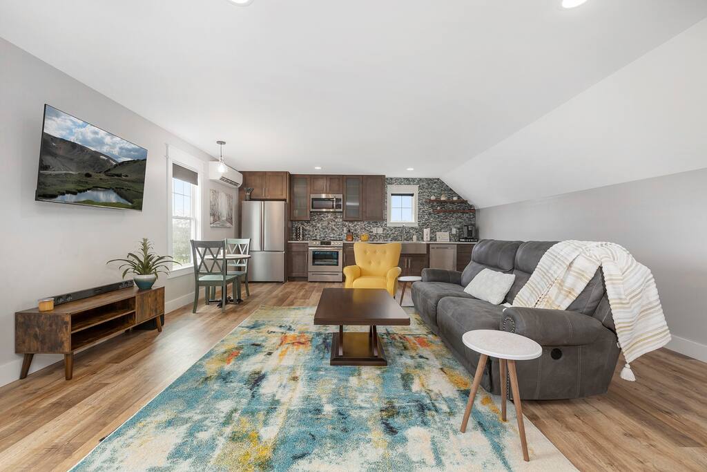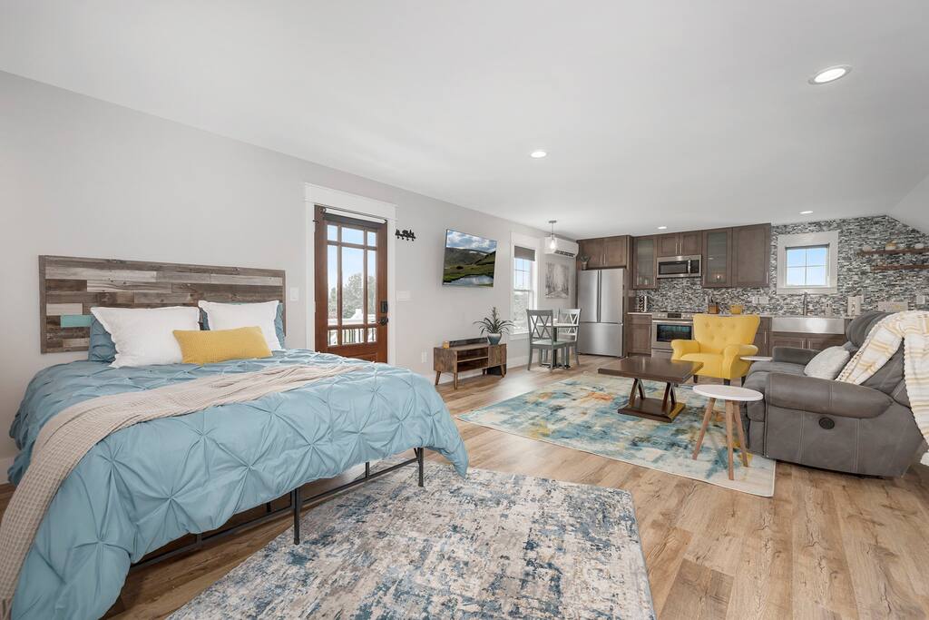 Modern large studio with lake views. Set up for traveling professionals and weekend get aways. Sit on the porch and watch the sun rise and set over the lake. This space was completed in 2021. Dedicated work space. Well equipped kitchen to meet all your cooking needs.